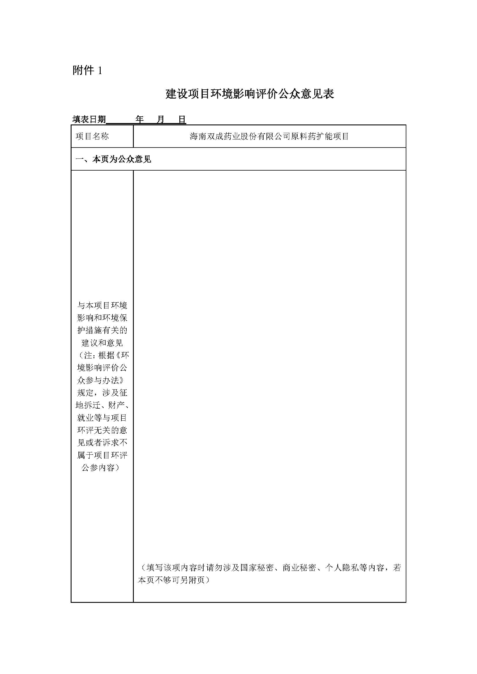 根据《中华人民共和国环境影响评价法》、《环境影响评价公众参与办法》(生态环境部令 第4号)的相关规定,需对“海南双成药业股份有限公司原料药扩能项目”进行环境影响评价第一次公示,以便让社会公众了解项目情况,同时也了解社会公众对本项目建设在环境保护方面的建议和意见,接受全社会公众的监督。